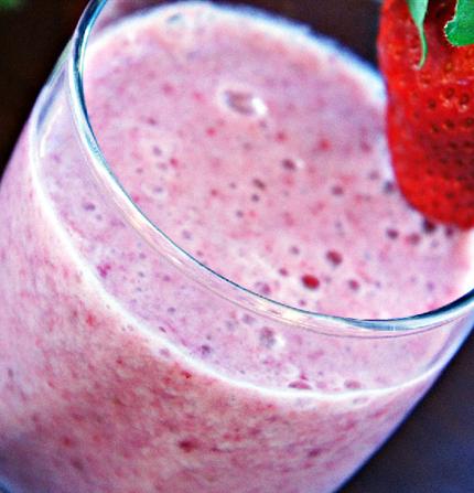 Place all ingredients in a blender except for garnish. Blend and pour into a glass then garnish with fresh strawberry. Serve and Enjoy!* Use any 2 fruits that you enjoy.