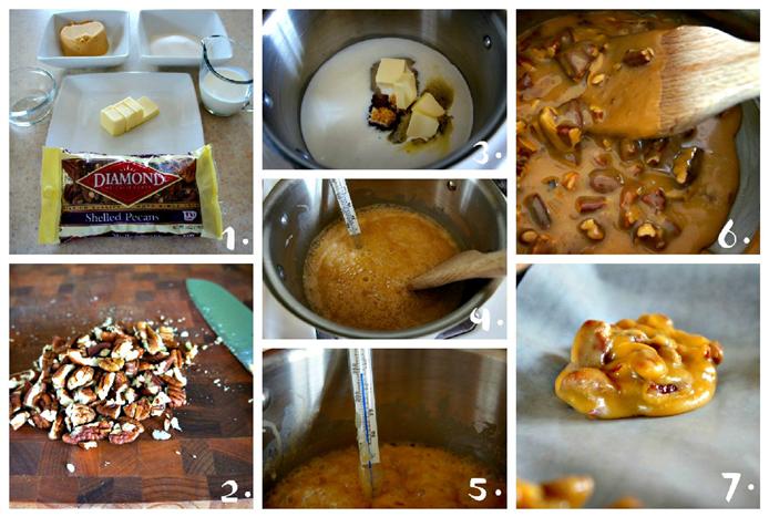 6. Turn the heat off and quickly stir in the pecans. Continue to stir for about 1 minute until the praline begins to slightly set.